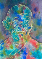 The assignment was to draw two public icons: one you love, and one you hate. We were to communicate our love and our hate in our choice of mark-marking, colors, pose, etc. I chose Gandhi for the public icon I love; I won’t be showing the “other” public icon. I will say that she appears regularly on Fox News, and has expressed the sentiment that women should be armed but not allowed to vote, since they have “no capacity to understand how money is earned.” That’s enough of a hint, I think.