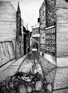 A great drawing….love the texture and detail…..I like that you put the mob down in the bottom part of the picture and sent them pellmelling up that narrow passageway….ominous! I always look at your blog as I love your work and the links you share like the Laura Cooperman one….