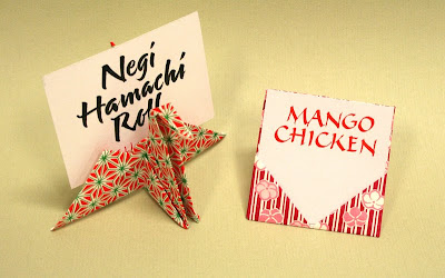 Last month I did some table cards to identify the food at a reception featuring Japanese and Chinese cuisine. I meant to take some photos before I let them go, but, as often happens, I forgot. So I was cleaning up the studio today and came across the remains of the project. These rejects show the Japanese and Chinese cards, respectively.