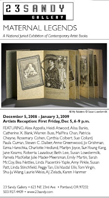 “Maternal Legends”, a juried exhibition of artist books, December 5 at 23 Sandy Gallery in Portland, Oregon. The online catalog is here.
