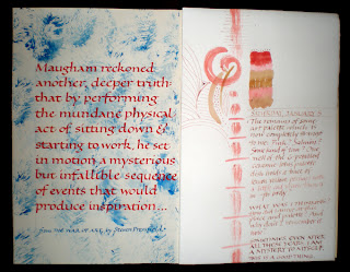 I’m reading The War of Art, by Steven Pressberg. It’s an empowering book, although I sometimes wonder at the pugilistic tone. The left side of the journal spread is a quotation from that book, about Somerset Maugham. The right side uses up the gouache that remained in a mysterious color palette that I don’t remember at all.