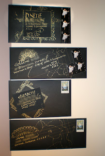 Here are the 4 envelopes I mailed yesterday for the Black Tie Exchange over at the Yahoo group, Calligraphy Exchange. The rules: Use a black envelope and either white or gold “ink” address in calligraphy.