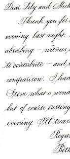 One of the great things about being a calligrapher is that after you’ve been to someone’s house for an evening which included a really wonderful dinner and great conversation, you can write a thank-you note that at least begins to do justice to the occasion.
